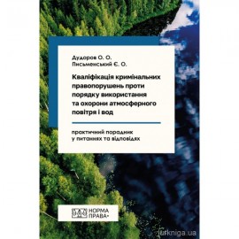 Практичний порадник присвячений розгляду питань, що виникають при здійсненні кваліфікації кримінальних правопорушень проти порядку використання та охорони атмосферного повітря і вод (статті 241–244 Кримінального кодексу України). Книга розрахована на працівників органів правопорядку, адвокатів, суддів, здобувачів вищої освіти, а також усіх, хто ц..