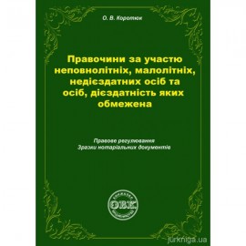 Видання представляє собою практичний посібник, розроблений з урахуванням чинного законодавства України. У книзі представлено аналіз чинного законодавства України, що регулює питання укладення різних видів правочинів за участю малолітніх осіб, неповнолітніх осіб, недієздатних осіб, а також осіб, дієздатність яких обмежено. Автором також розроблено ч..